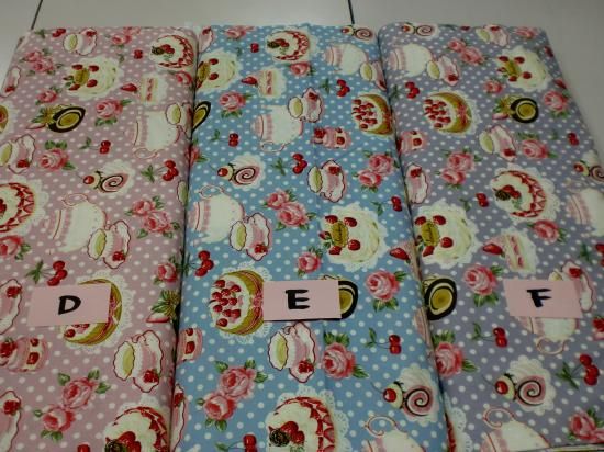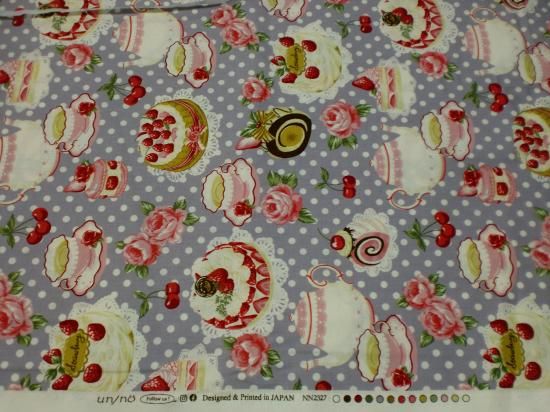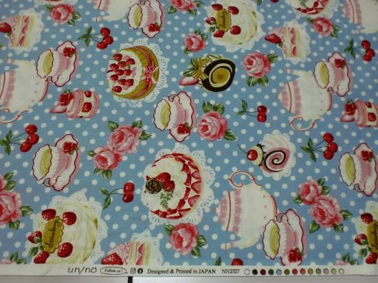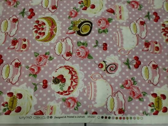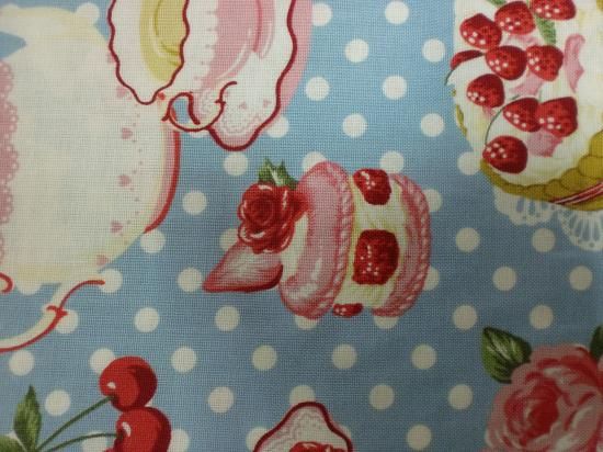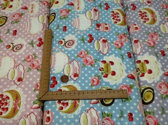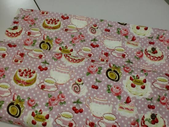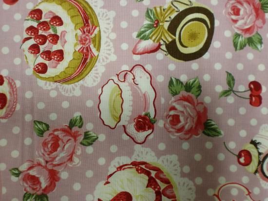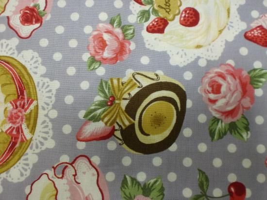 ドット地に可愛くておいしそうなケーキが並んだ柄のシーチング