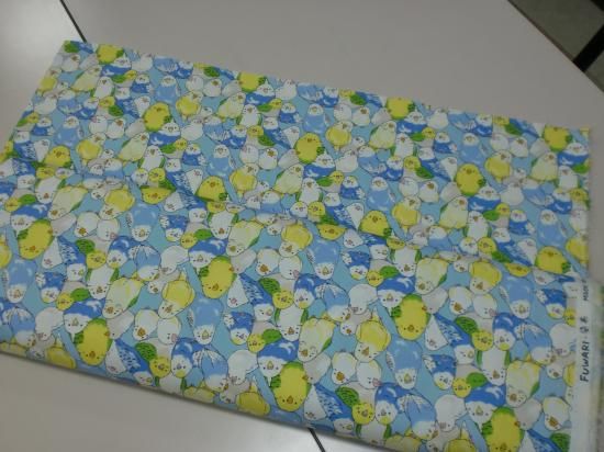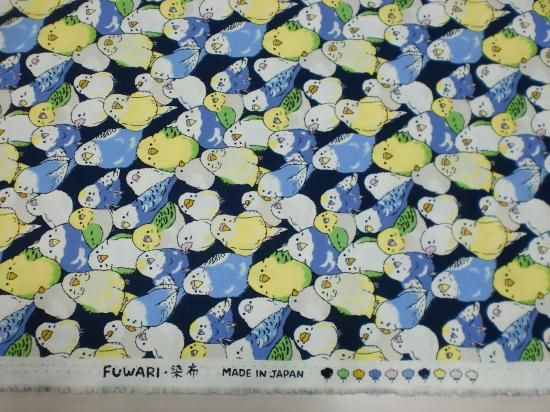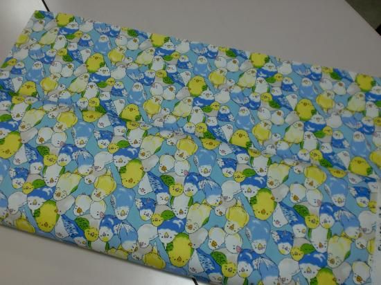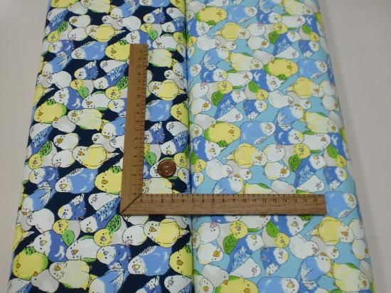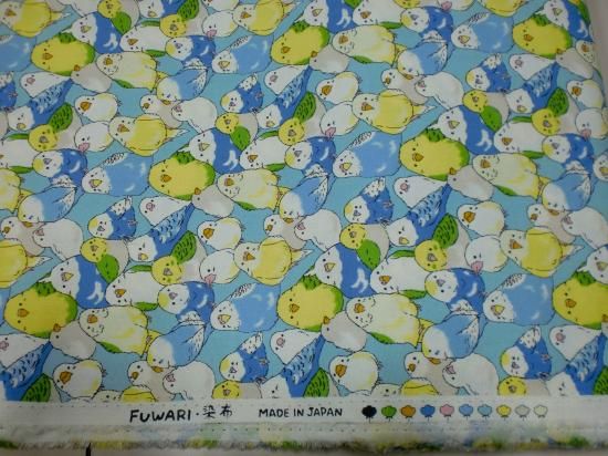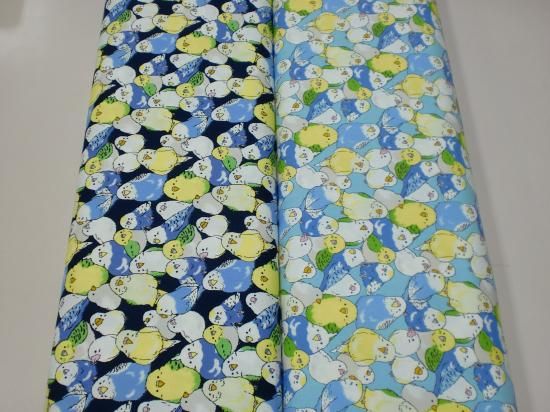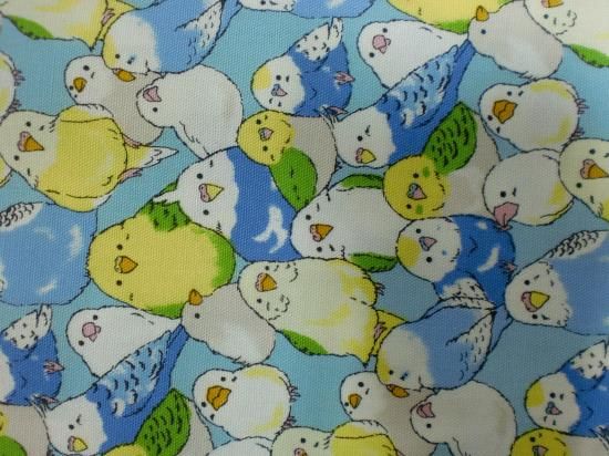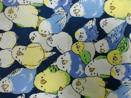 黄色、青、白のセキセイインコ、文鳥さんが描かれた賑やかなデザイン